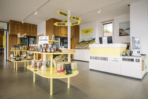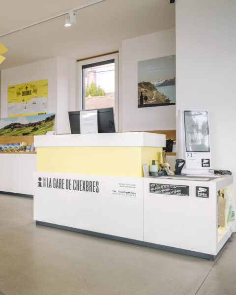 Nos compétences en design d’intérieur, scénographie et identité graphique ont été mobilisées pour transformer la gare de Chexbres en un nouvel espace pensé pour accueillir les visiteur·euses et mettre en valeur les produits locaux. Notre intervention en a fait une véritable porte ouverte sur le Lavaux!